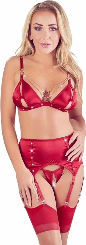 Ga voor pure verleiding met deze mooie en vooral sexy 3 delige jarretel set van Abierta Fina! De zachte rode stof heeft een satijnlook en rekt mee voor een mooie aansluitende pasvorm. De top heeft open cups en opvallende goudkleurige afneembare kettinkjes met kleine glinsterende steentjes. De jarretelgordel heeft verstelbare jarretelbandjes en is goed te combineren met jouw favoriete paar kousen. De bijpassende string heeft een sexy open kruisje en maakt de set compleet.