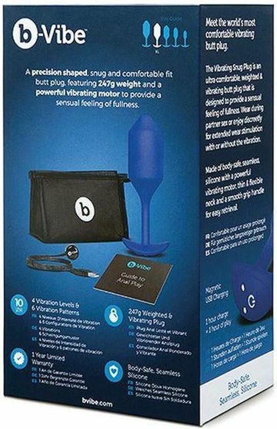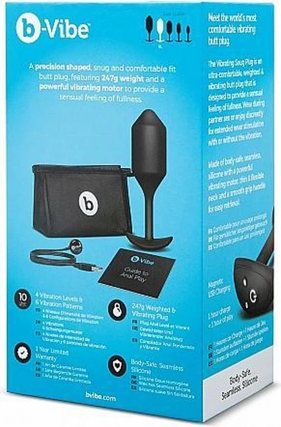 Vibrerende Snug Plugs worden geleverd in een designer verpakking en bevatten een handige opbergtas. We hebben ook niet ??n – maar twee handleidingen voor zowel nieuwkomers in anaal spelen als gevorderde gebruikers. De handleiding voor anaal van b-Vibe staat boordevol informatie over anaal spelen, terwijl onze handleiding voor vibrerende snugplugs nuttige tips bevat, inclusief hoe je je buttplug correct kunt plaatsen en verwijderen.