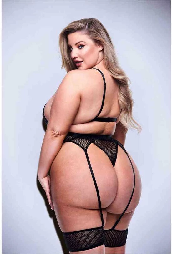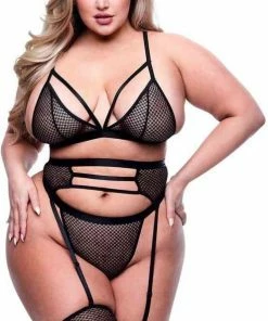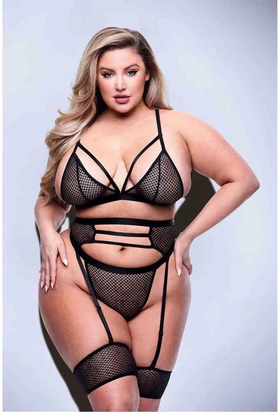 3PC STRAPPY BRA, GARTER & PANTY SET Zwart, QUEEN Size.
