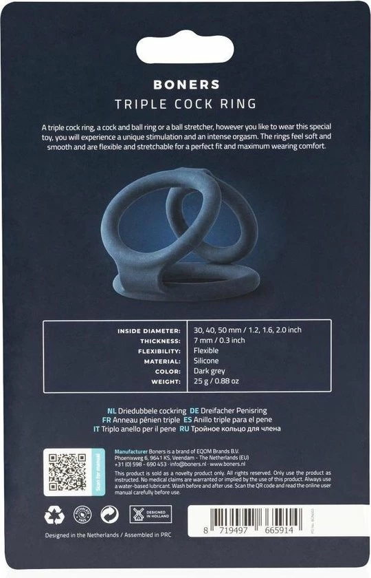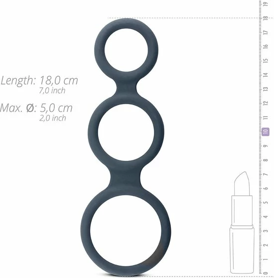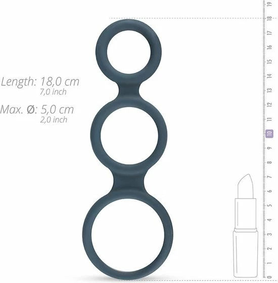 De Triple Ring uit de Boners collectie is een veelzijdige sextoy die de geslachtsdelen meer laat opvallen. De driedelige cockring wordt om de penis en balzak gedragen en zorgt zo voor meer volume en een uitdagende uitstraling. De ringen zijn gemaakt van zacht siliconen dat geurloos en niet poreus is. Hierdoor geniet je zorgeloos, gaan de cockringen eindeloos mee en kun je ze eenvoudig schoonmaken. Daarnaast zijn de ringen zacht en rekbaar waardoor ze mooi aansluiten.
