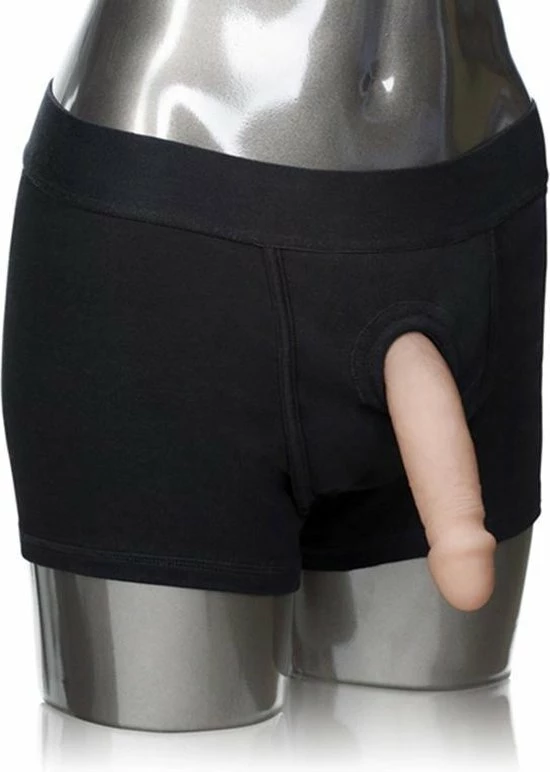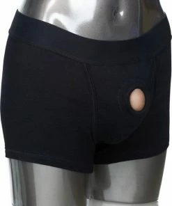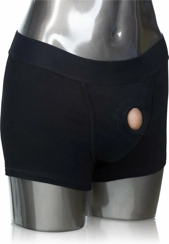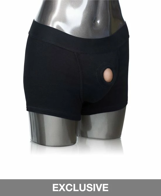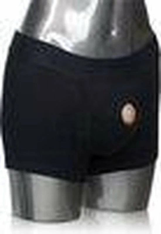 Cut in classic full coverage boxer brief style, the Harness sits level with hips, holding comfortably steady with its wide elastic waistband. The front panel proves fantastic attention to detail, featuring a sturdy, reinforced O ring plus internal strap. Stretching subtly to accommodate most probes, the ring also holds tight to an inserted packer, ensuring reliable placement with no shifting.