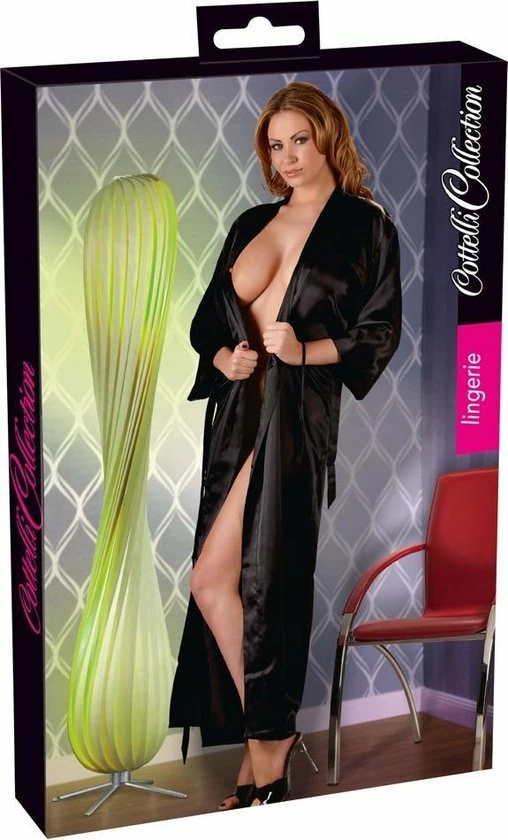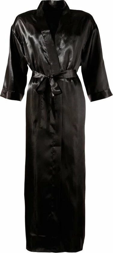 Long gloosy zwarte kimono gemaakt van zacht vleiend satijn. Met riem.