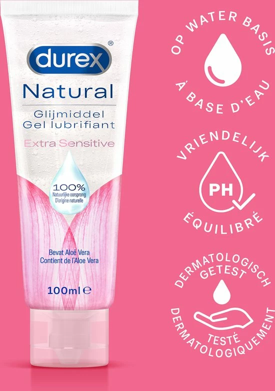 Veel vrouwen vinden dat het gebruik van glijmiddel hun seksuele ervaring in het algemeen versterkt. Ze ervaren op verschillende momenten in hun menstruatiecyclus een beetje droogte – het gebruik van glijmiddel is dus volkomen normaal. Durex Naturals Extra Sensitive glijmiddel is gemaakt van 100% natuurlijke ingredi?nten en werd ontwikkeld om seks nog aangenamer te maken. De lichte formule op waterbasis bevat geen toegevoegde geur- en kleurstoffen, is pH-vriendelijk en werkt zachtjes met je lichaam om zelfs de meest gevoelige huid te hydrateren en te kalmeren met natuurlijk alo? vera-extract. De gel kan met latex condooms en seksspeeltjes van Durex gebruikt worden. Het is goed om op de hoogte te zijn, dus lees altijd de instructies.