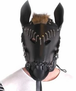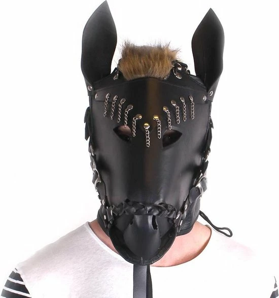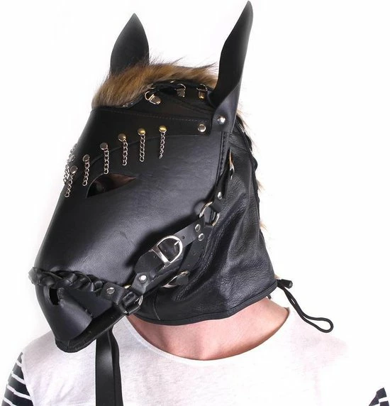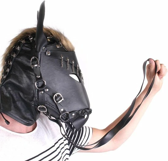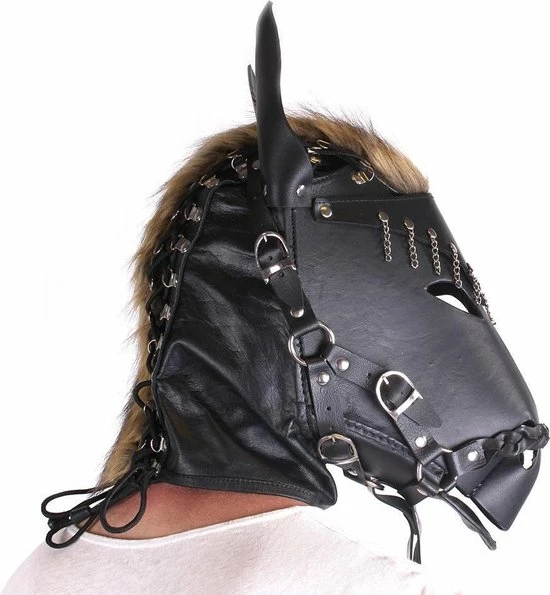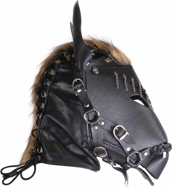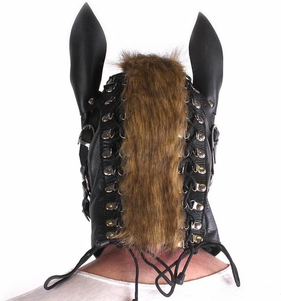 Deze unieke leren paardekop is een prachtig exemplaar met afgewerkte studs en een verstelbare veter aan de achterkant. Paardehaar over het masker en rechtopstaande oren van mooi leder. Er zit ook een lease bij om het paard voort te trekken. Een mooi masker voor rollenspel als u eindelijk paardje wilt rijden.