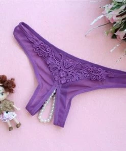 Paarse G-string met ingelegde parels in het kruis. De kanten details en de sierlijke afwerking geven deze string een luxe pikante uitstraling. Een kwaliteitsproduct uit onze collectie.