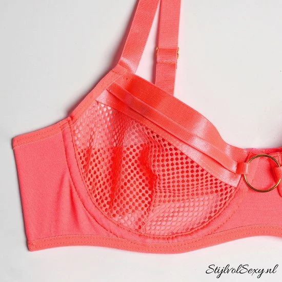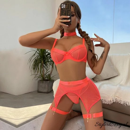 Deze erotische lingerie set met halsband is het perfect ondergoed setje dat je nodig hebt voor een ondeugende avond vol verleiding en romantiek. Het 3-delige lingerie setje heeft een mooie oranjeachtige kleur en is gemaakt van een zeer hoge kwaliteit doorzichtige en rekbare stof. Het setje bestaat uit een 3/4 cup bh met beugel, een jarretel gordel, bijpassende sexy string en een halsband. De beugel-bh heeft doorzichtige 3/4 cups. De dubbele bh haaksluiting op de rug heeft drie standen en de schouderbandjes zijn verstelbaar voor een perfecte pasvorm. De jarretelgordel is geheel doorzichtig en loopt aan de voor en achterzijde in een punt naar de jarretel banden die om de benen zitten. Het bijpassende broekje is een sexy string gemaakt van dezelfde doorzichtige oranje stof. De halsband heeft aan de voorzijde een ring en heeft aan de achterzijde schuifsluiting. Dit luxe lingerie setje is een perfecte aanvulling op de lingeriegarderobe van iedere sexy vrouw.