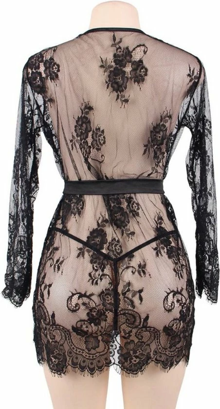 Deze mooie zwarte kimono is gemaakt van doorzichtig kant met een bloemenmotief. Alle randen van de kimono zijn speels afgewerkt met wimperkant. Het ceintuur voor rond de middel is gemaakt van een mooie gladde satijnachtige stof. Het ontwerp van deze korte kimono is dat deze aan de voorzijde iets moet openvallen. Deze kimono is sexy bedoeld en moet dus niet met een grote overslag worden gedragen. De kimono is doorschijnend en vormt samen met de bijgeleverde kanten string een sexy lingerie setje, waarmee je eindeloos kunt combineren met je favoriete nachtjurkje of lingerie setje en natuurlijk met hoge hakken. Laat je geliefde genieten van jouw mooie vrouwelijke vormen.