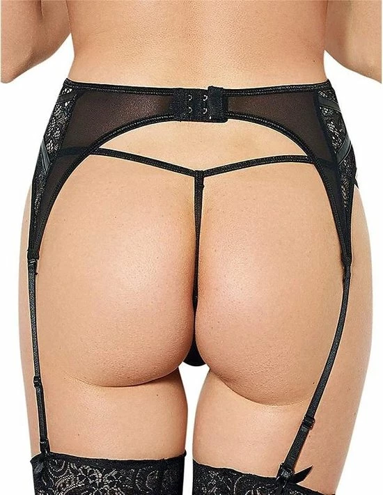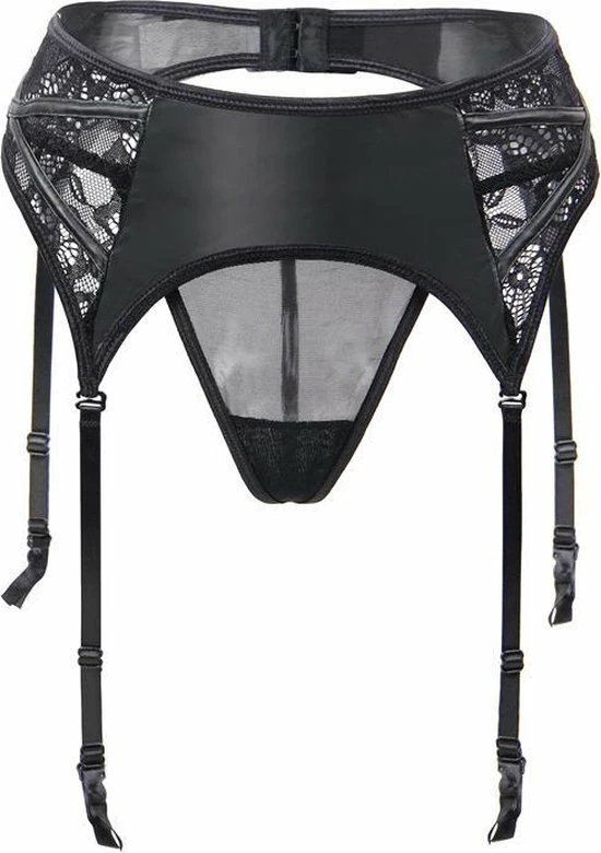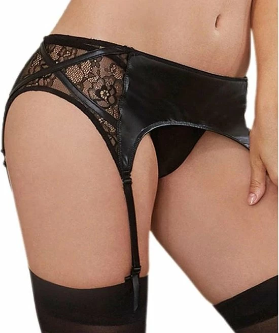 Dolly is een leatherlook jarretelgordel met kant en is voorzien van vier verstelbare jarretels. Deze sexy zwarte kousengordel is aan de voorzijde voorzien van een zogenaamde leather look. De zijkanten zijn gemaakt van mooi kant met een kruis als extra stijlvol detail. Aan de achterzijde zit een dubbele haaksluiting met 3 standen, zodat de jarretelgordel prima aan te passen is aan jouw maat. Het materiaal van de jarretelgordel is zachte en rekbaar en onzichtbaar als je deze onder rok draagt. Bij de jarretelgordel wordt ook een doorzichtige string geleverd in dezelfde kleur als de gordel. Een mooie jarretelgordel geeft elke vrouw klasse en maakt haar super verleidelijk.