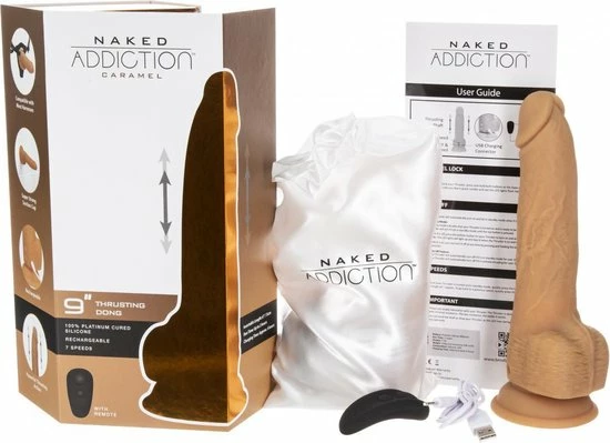 Opwindende, realistische dildo met handige afstandsbediening uit de Naked Addiction Collection. Geniet solo of samen met je partner van een heerlijke stimulatie. De dildo maakt een op en neer gaande beweging en heeft 7 verschillende standen. Dankzij de harde kern beleef je een levensecht gevoel. Door de ronde eikel, geaderde schacht en ballen is deze dildo bijna niet van een echte penis te onderscheiden. De dildo is gemaakt van lichaamsveilig siliconen. Deze dildo is voorzien van een zuignap die op ieder glad oppervlakte blijft plakken. Zo kun je ook heerlijk handsfree genieten. Uiteraard kun je de dildo ook in combinatie met een harnas gebruiken. Je krijgt er een luxe toybag bij cadeau zodat je de dildo stofvrij kunt opbergen. Hij is weer snel oplaadbaar met de bijgeleverde USB-kabel. De afstandsbediening werkt op batterijen.Maak de dildo na gebruik schoon met lauwwarm water en een milde antibacteriële zeep of een toycleaner. Dep hem droog met een pluisvrije doek.
