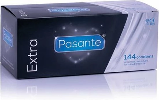 Pasante Extra condooms zijn wat dikker en zijn voorzien van extra glijmiddel, zodat je zo veilig mogelijk kunt vrijen. Dit condoom is uitstekend voor anale seks te gebruiken, echter adviseren wij daarbij om altijd extra glijmiddel te gebruiken voor meer comfort en veiligheid.Pasante Extra Safe condooms zijn gemaakt van natuurlijk rubber latex, met reservoir en glijmiddel.Eigenschappen:- Smaak: Neutraal- Glijmiddel: Normaal- Kleur: Transparant- Structuur: Glad- Grootte: Gemiddeld- Nominale breedte: 54 mm- Dikte: Extra Sterk- Aantal per verpakking: 144 stuks- Merk: PasanteAanbevolen voor:In principe is ieder getest condoom geschikt voor vaginaal, oraal en anaal contact, mits de pasvorm goed is en er voldoende glijmiddel gebruikt wordt.