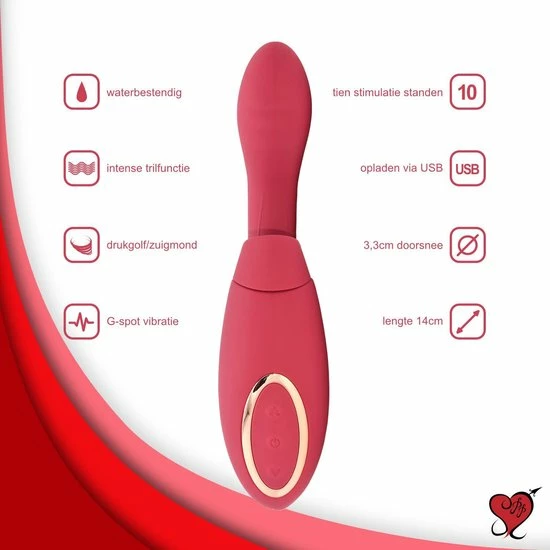 De Perfect Pleaser bevat 2 verschillende motoren. Deze twee motoren stimuleren beide uiteinden van de vibrator. De flexibele ronding zorgt voor een perfecte pasvorm die geschikt is voor een vaginale penetratie. Aan de andere kant geeft onze vibrator de mogelijkheid voor een luchtdruk stimulatie die door een drukgolf wordt bereikt. Dit maakt de vibrator ideaal om zowel de G spot als de clitoris te stimuleren om zo te genieten van een overheerlijke orgasme. De vibrator heeft 10 verschillende vibratie standen en 7 verschillende zuig variaties.