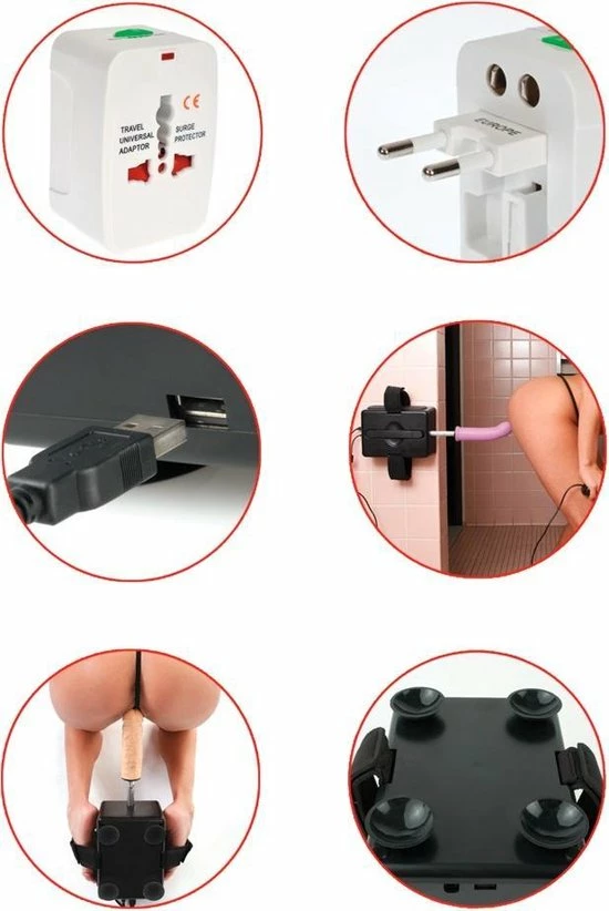 Seksmachine op netstroom in handig, compact formaat met 2 dildo’s en een vibrator. De sexmachine heeft een handvat aan de bovenkant en manchetten aan weerszijden voor de handen of voeten. De manchetten aan de zijkanten kunnen worden aangepast met de klittenbandsluitingen. De 2 meegeleverde dildo’s kunnen eenvoudig op de seksmachine worden geschroefd. De stoten van de seksmachine gaan van 75 tot 183 stoten per minuut en zijn in te stellen met de knop op het apparaat. De vibrator kan in het apparaat (USB) worden gestoken voor extra stimulatie, bijvoorbeeld op de clitoris of tepels. De multi-speed vibraties zijn in te stellen met de draaiknop op het speeltje en ook te combineren met de thrust functie. De seksmachine heeft 4 sterke zuignappen die stevig op gladde ondergronden blijven plakken waardoor handsfree plezier mogelijk is. De seksmachine is klein, compact ontwerp is heerlijk gemakkelijk vast te houden waardoor het gemakkelijk te vervoeren is tijdens het reizen. Dankzij de meegeleverde universele voedingsadapter kan de machine overal ter wereld worden gebruikt.