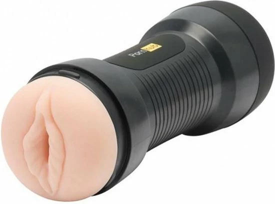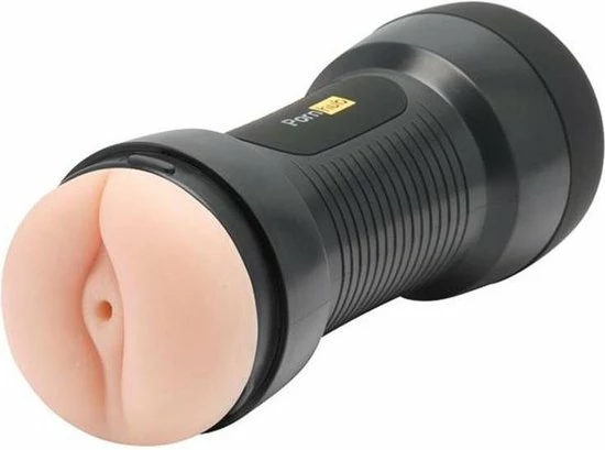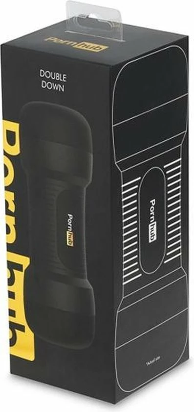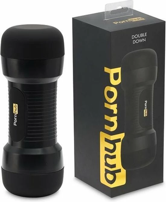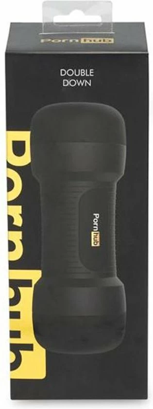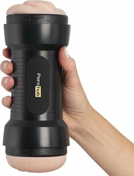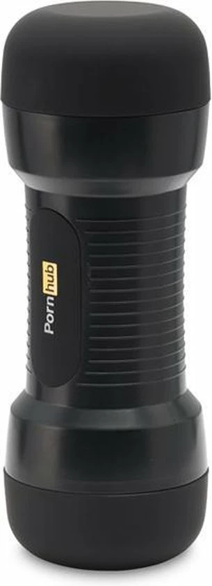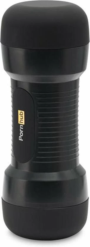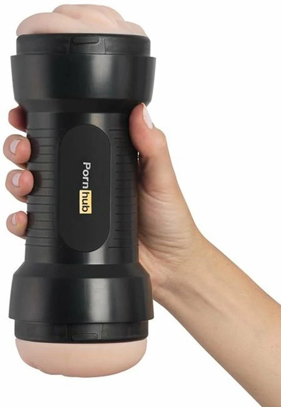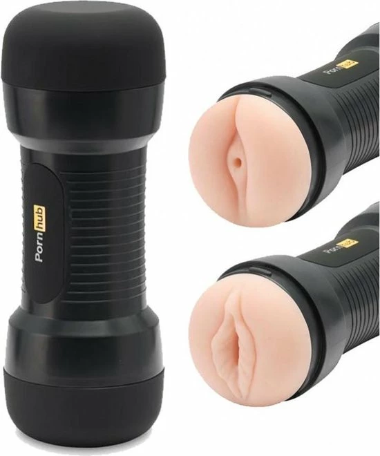 Zachte, dubbele stroker met vagina en kont opening, met een getextureerde binnenzijde. Matzwarte behuizing met grepen en Pornhub-branding.