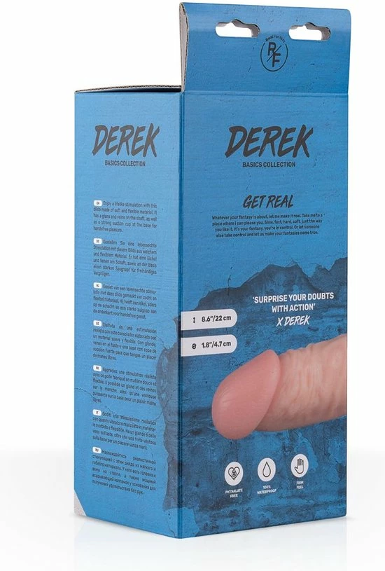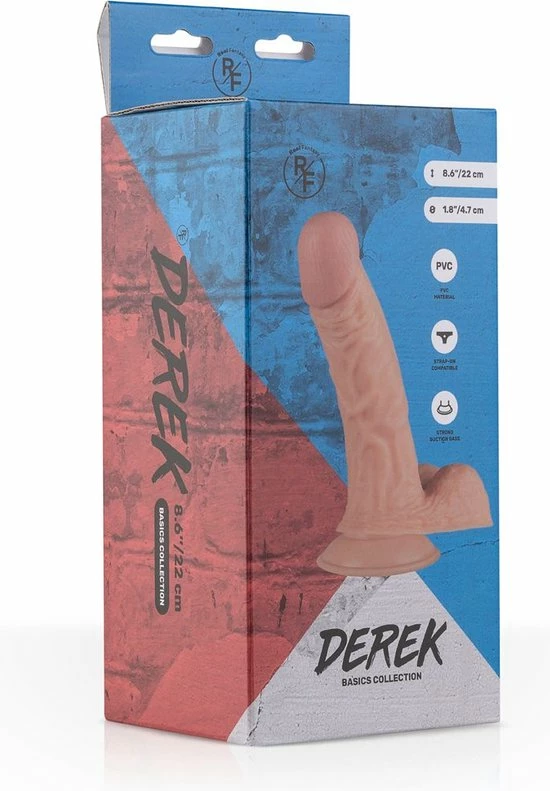 Derek is een realistische dildo van zacht, flexibel materiaal. De Real Fantasy dildo heeft een sterk geaderde schacht die licht gebogen is. Derek voelt glad aan en buigt mee met elke beweging. Zijn sterke zuignap zal ervoor zorgen dat hij op de juiste positie blijft wanneer je hem op een muur of vloer plaatst. Gebruik dit seksspeeltje met je favoriete glijmiddel voor meer comfort. Reinigen kan eenvoudig met lauwwarm water en toycleaner. De perfecte man bestaat niet, de perfecte dildo gelukkig wel! Het merk Real Fantasy brengt jou alle voordelen van de man gebundeld in een realistische dildo collectie. Kies je favoriet en maak elke solo-sessie levensecht.