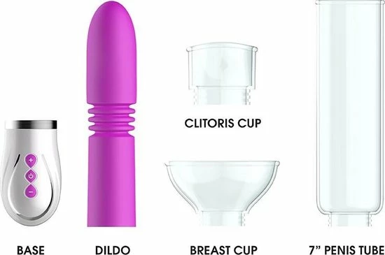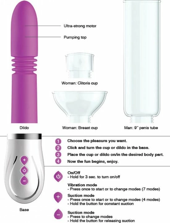 Verhoog het volume met deze veelzijdige 4-in-1 paren-pompset van Shots. De pompset bevat hulpstukken voor het oppompen van borsten, clitoris of penis waardoor de erogene zones opzwellen. Dit zorgt voor een ultiem sensatie gevoel!Maar niet alleen dat; er zit ook een stuwend dildo-hulpstuk bij dat zorgt voor interne stimulatie. Met 4 verschillende zuigsterktes en 7 verschillende vibratie standen zijn de combinatiemogelijkheden met deze set eindeloos en met de krachtige motor van 11.000 omw/min, raakt u de juiste plekjes voor een kietelend, tintelend genotsgevoel. Deze draaiende sensatie is daarom een ‘must have’ voor bij je thuis! Verkrijgbaar in de kleuren zwart, paars en roze.