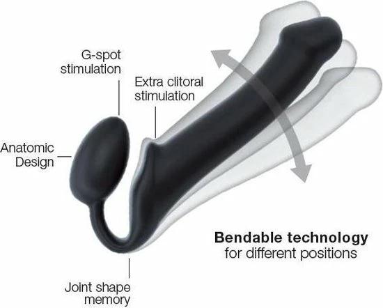 Siliconen buigbare voorbinddildo. Met de buigbare technologie en het Joint Shape memory kunt u de dildo in verschillende posities gebruiken en instellen. Met extra G-spot en Clitoral-stimulatie. Beschikbaar in maat S-M-L-XL in de kleuren Black, Flesh en Purple