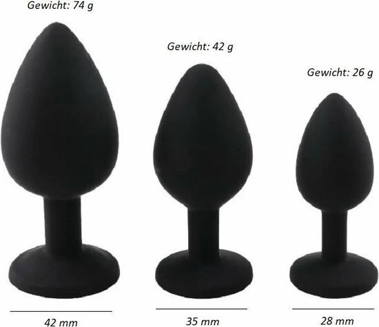 We bieden u een set van drie verschillende maten aan: S 26 gram 2.8 cm, M 42 gram 3.5 cm, L 74 gram 4.2 cm. Voor ieders wat wilds! Deze buttplugs zijn mooi afgewerkt met een diamanten steen. Deze zijn voor hygiene makkelijk schoon te maken.