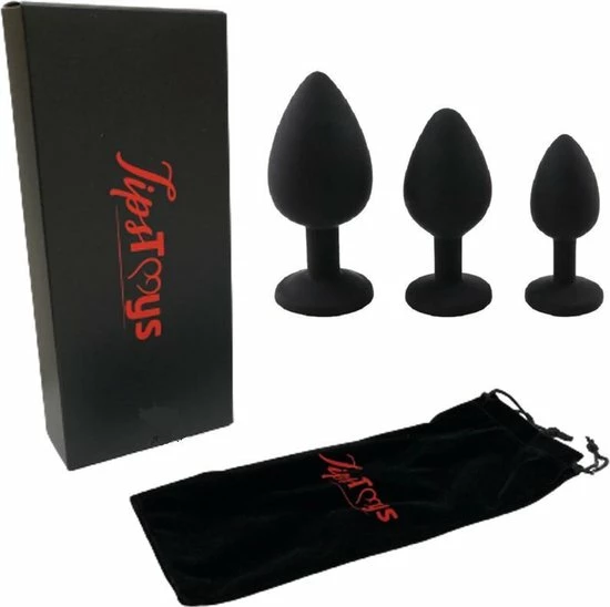 Kinky, zwarte kleurige Set buttpluggen van TipsToys. Met dit speeltje bereik jij je ultieme hoogtepunt. De zwart kleurige buttplug heeft een prachtige vormgeving en stevig materiaal. De plug is perfect voor dames en/of heren die van elegant en stijlvol houden. Het gladde seksspeeltje heeft een rond middenstuk en een smalle hals. Als je de plug naar binnen schuift, dan kan ‘ie wat koud aanvoelen, wat ook wel weer fijn kan aanvoelen. Anders laat hem even opwarmen in heet water voor een extra fijn gevoel. De drie buttpluggen zitten netjes in suede zak om schade te voorkomen en zolang mogelijk te kunnen genieten van deze kinky speeltjes.