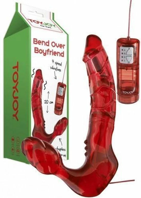 De ToyJoy Bend Over Boyfriend is een rode voorbinddildo met een omvang van 40 millimeter. In tegenstelling tot andere dildo’s kun je deze vastzetten door het eivormige deel in je vagina in te brengen. Hier zorgt het eitje voor een zachte stimulatie. Met het dildogedeelte kun je vervolgens penetreren. Dankzij de waterbestendigheid kun je het speeltje ook in de badkamer gebruiken, bijvoorbeeld in bad of onder de douche. Het eivormige deel kan als vibrator worden gebruikt. De afstandsbediening is middels een draad aan de dildo verbonden.