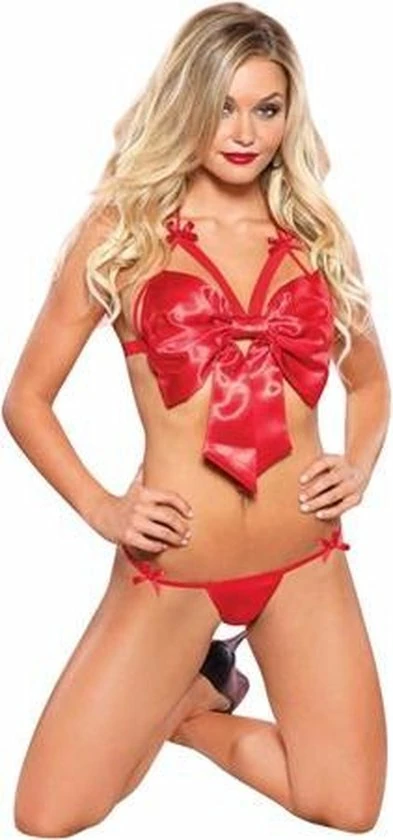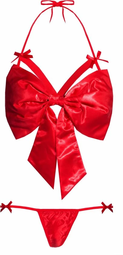2-Delig Luxe Satijnen BH Set bestaande uit een bra top met een extra grote satijnen strik aan de voorzijde welke vast zit aan de open cup. Aan de achterzijde zit een haaksluiting. Het set is compleet met bijpassende G-string100% POLYESTER