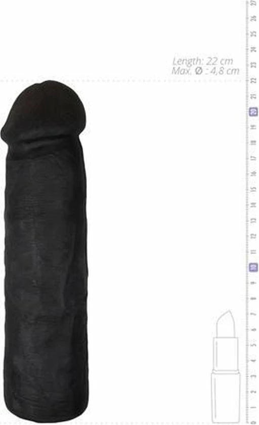 Grote, natuurlijke penis sleeve. Totale lengte ongeveer 22 cm, individueel verstelbaar, totale diepte bij penetratie 20 cm, doorsnede buitenkant 4,2 tot 4,8 cm, flexibel aan de binnenkant.