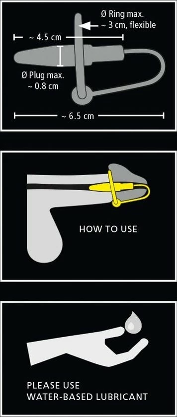 Ring binnen diameter 3 cm (zeer elastisch). Dilator 4,5 cm lang, diameter 0,3-0,8 cm. Paars / zilver kleuren. Materiaal: siliconen, metaal, ftalaat-vrij volgens EU-richtlijn 1907/2006 / EG.